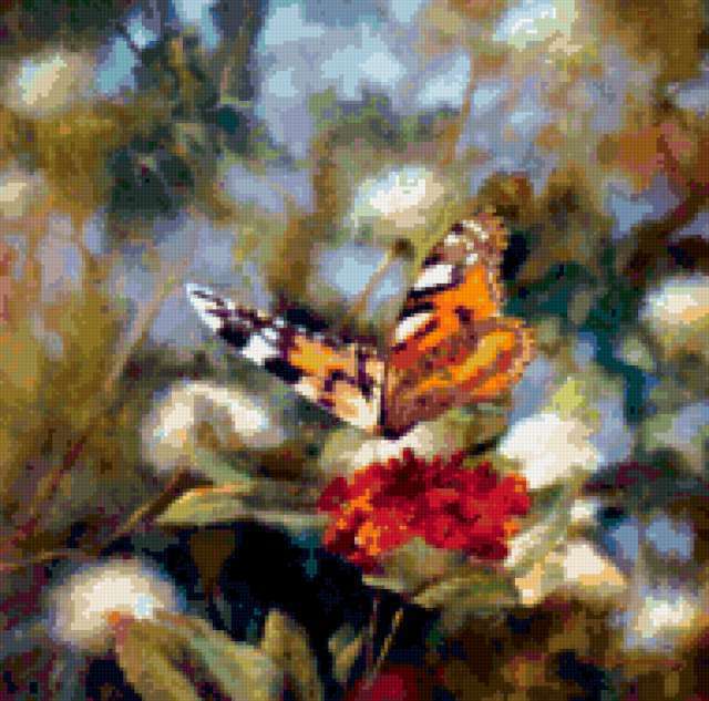 Ориентировочно так, схема вышивки «&6435», созданная автором Axlamonka, будет выглядеть при отшиве на канве. Размер данной вышивки равен 190x188 крестов, при этом используется 83 цветов. Ключевые слова, по которым можно найти эту схему: бабочка, цветок, подушка. Также, вы можете взглянуть на оригинальную картинку, соответствующую данной схеме вышивки.