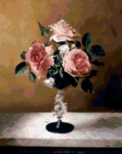 Ориентировочно так, схема вышивки «&6539», созданная автором Axlamonka, будет выглядеть при отшиве на канве. Размер данной вышивки равен 151x190 крестов, при этом используется 62 цветов. Ключевые слова, по которым можно найти эту схему: цветы, букет, натюрморт, картина, розы. Также, вы можете взглянуть на оригинальную картинку, соответствующую данной схеме вышивки.