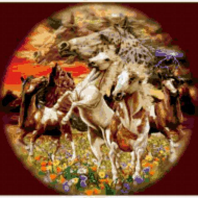 Ориентировочно так, схема вышивки «***», созданная автором milacha974, будет выглядеть при отшиве на канве. Размер данной вышивки равен 190x190 крестов, при этом используется 55 цветов. Ключевые слова, по которым можно найти эту схему: лошади, животные. Также, вы можете взглянуть на оригинальную картинку, соответствующую данной схеме вышивки.