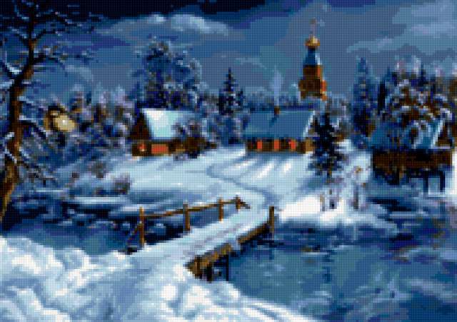Ориентировочно так, схема вышивки «***», созданная автором milacha974, будет выглядеть при отшиве на канве. Размер данной вышивки равен 190x134 крестов, при этом используется 47 цветов. Ключевые слова, по которым можно найти эту схему: зима, природа. Также, вы можете взглянуть на оригинальную картинку, соответствующую данной схеме вышивки.