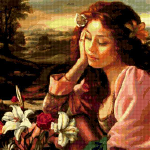 Ориентировочно так, схема вышивки «***», созданная автором Kamyshka, будет выглядеть при отшиве на канве. Размер данной вышивки равен 190x190 крестов, при этом используется 77 цветов. Ключевые слова, по которым можно найти эту схему: девушка, цветы, красиво, печаль. Также, вы можете взглянуть на оригинальную картинку, соответствующую данной схеме вышивки.