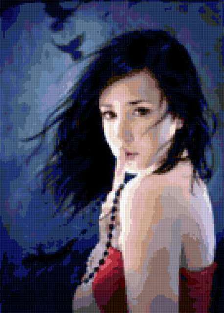 Ориентировочно так, схема вышивки «*», созданная автором gala1966, будет выглядеть при отшиве на канве. Размер данной вышивки равен 136x190 крестов, при этом используется 56 цветов. Ключевые слова, по которым можно найти эту схему: женщины. Также, вы можете взглянуть на оригинальную картинку, соответствующую данной схеме вышивки.