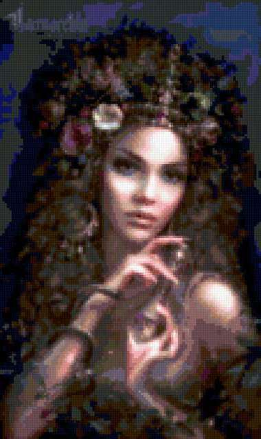 Ориентировочно так, схема вышивки «:-)», созданная автором Troyanda, будет выглядеть при отшиве на канве. Размер данной вышивки равен 113x190 крестов, при этом используется 49 цветов. Ключевые слова, по которым можно найти эту схему: девушка. Также, вы можете взглянуть на оригинальную картинку, соответствующую данной схеме вышивки.