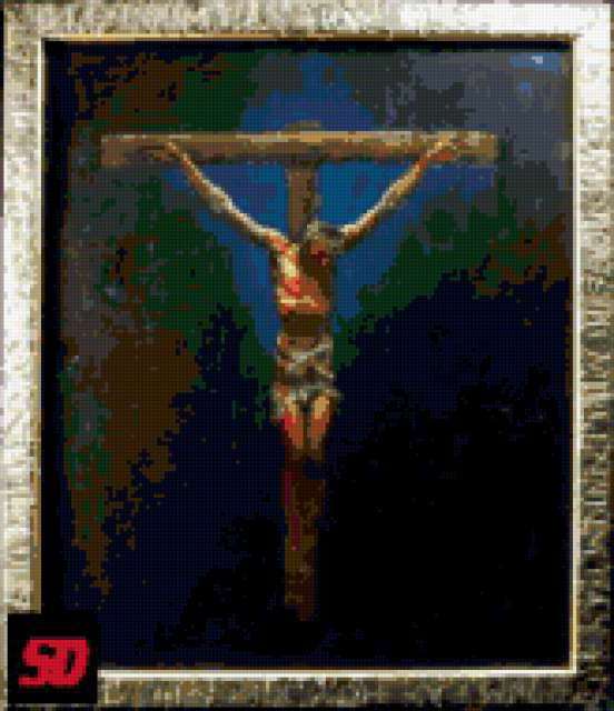 Ориентировочно так, схема вышивки «§014», созданная автором dimi122, будет выглядеть при отшиве на канве. Размер данной вышивки равен 164x190 крестов, при этом используется 46 цветов. Ключевые слова, по которым можно найти эту схему: религия. Также, вы можете взглянуть на оригинальную картинку, соответствующую данной схеме вышивки.