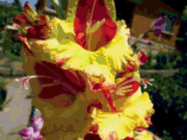 Ориентировочно так, схема вышивки «§256», созданная автором dimi122, будет выглядеть при отшиве на канве. Размер данной вышивки равен 180x135 крестов, при этом используется 79 цветов. Ключевые слова, по которым можно найти эту схему: цветы. Также, вы можете взглянуть на оригинальную картинку, соответствующую данной схеме вышивки.