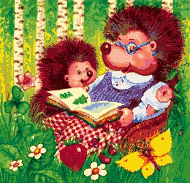 Ориентировочно так, схема вышивки «Ёжики», созданная автором poltanya, будет выглядеть при отшиве на канве. Размер данной вышивки равен 190x183 крестов, при этом используется 37 цветов. Ключевые слова, по которым можно найти эту схему: ёжики, ежи, клубника, детки, бабочка, лес, ёжик. Также, вы можете взглянуть на оригинальную картинку, соответствующую данной схеме вышивки.