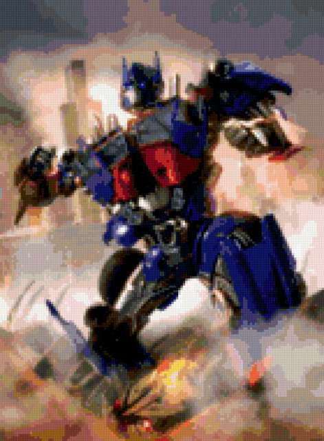 Ориентировочно так, схема вышивки «Автобот-Оптимус Прайм», созданная автором Nadena_love, будет выглядеть при отшиве на канве. Размер данной вышивки равен 140x190 крестов, при этом используется 78 цветов. Ключевые слова, по которым можно найти эту схему: трансформер, автобот. Также, вы можете взглянуть на оригинальную картинку, соответствующую данной схеме вышивки.