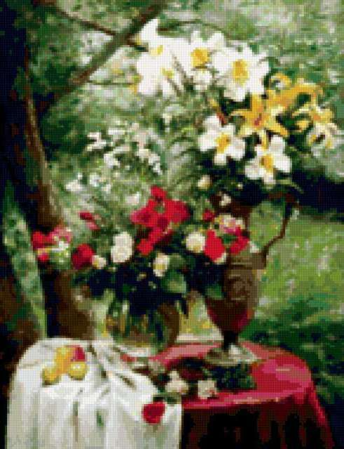 Ориентировочно так, схема вышивки «Автор Головин», созданная автором burova, будет выглядеть при отшиве на канве. Размер данной вышивки равен 146x190 крестов, при этом используется 64 цветов. Ключевые слова, по которым можно найти эту схему: картина, цветы, натюрморт, букет. Также, вы можете взглянуть на оригинальную картинку, соответствующую данной схеме вышивки.