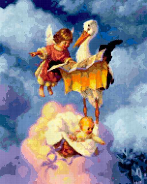 Ориентировочно так, схема вышивки «Аист счастья», созданная автором avevstigneeva, будет выглядеть при отшиве на канве. Размер данной вышивки равен 152x190 крестов, при этом используется 73 цветов. Ключевые слова, по которым можно найти эту схему: сказка, детям. Также, вы можете взглянуть на оригинальную картинку, соответствующую данной схеме вышивки.