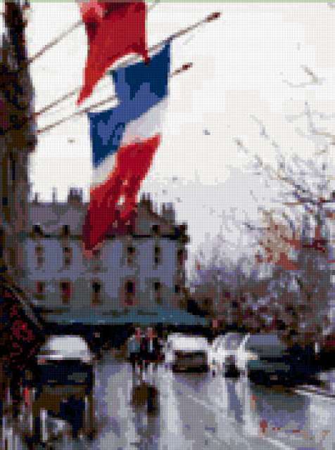 Ориентировочно так, схема вышивки «Акварельная Франция», созданная автором GamBrinus, будет выглядеть при отшиве на канве. Размер данной вышивки равен 134x180 крестов, при этом используется 45 цветов. Ключевые слова, по которым можно найти эту схему: город. Также, вы можете взглянуть на оригинальную картинку, соответствующую данной схеме вышивки.