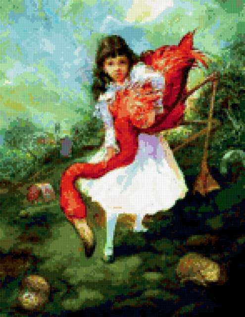 Ориентировочно так, схема вышивки «Алиса играет в крокет», созданная автором alena4, будет выглядеть при отшиве на канве. Размер данной вышивки равен 147x190 крестов, при этом используется 74 цветов. Ключевые слова, по которым можно найти эту схему: алиса, девочка, фламинго, ёжики, птица, сказка. Также, вы можете взглянуть на оригинальную картинку, соответствующую данной схеме вышивки.