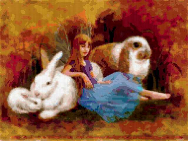 Ориентировочно так, схема вышивки «Алиса», созданная автором incerta, будет выглядеть при отшиве на канве. Размер данной вышивки равен 190x143 крестов, при этом используется 70 цветов. Ключевые слова, по которым можно найти эту схему: красота.волшебство.любовь.ева.нати.. Также, вы можете взглянуть на оригинальную картинку, соответствующую данной схеме вышивки.