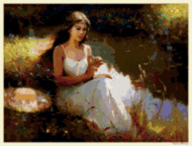 Ориентировочно так, схема вышивки «Алёнушка», созданная автором Svetla_Nochka, будет выглядеть при отшиве на канве. Размер данной вышивки равен 190x144 крестов, при этом используется 70 цветов. Ключевые слова, по которым можно найти эту схему: человек, аленушка, девушка, леди, люди, пейзаж, природа, речка. Также, вы можете взглянуть на оригинальную картинку, соответствующую данной схеме вышивки.