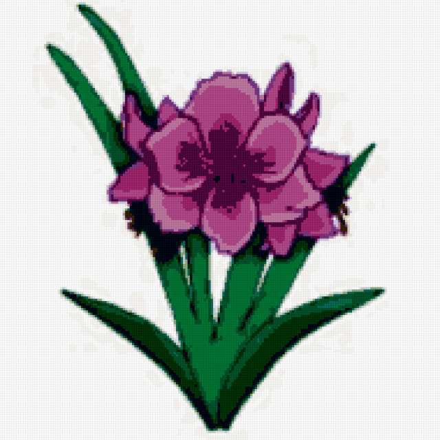 Ориентировочно так, схема вышивки «Амариллис», созданная автором Eddy, будет выглядеть при отшиве на канве. Размер данной вышивки равен 190x190 крестов, при этом используется 23 цветов. Ключевые слова, по которым можно найти эту схему: лиловые цветы, амариллис. Также, вы можете взглянуть на оригинальную картинку, соответствующую данной схеме вышивки.