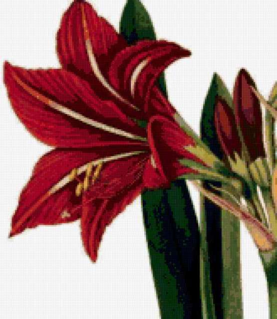 Ориентировочно так, схема вышивки «Амариллис», созданная автором julia78, будет выглядеть при отшиве на канве. Размер данной вышивки равен 165x190 крестов, при этом используется 56 цветов. Ключевые слова, по которым можно найти эту схему: амариллис, цветок. Также, вы можете взглянуть на оригинальную картинку, соответствующую данной схеме вышивки.