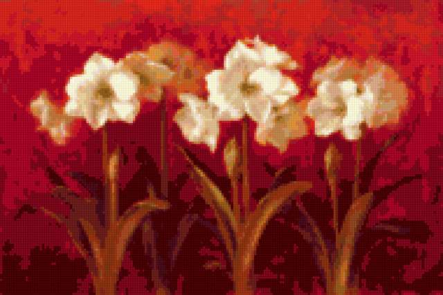 Ориентировочно так, схема вышивки «Амариллис», созданная автором eldi_22, будет выглядеть при отшиве на канве. Размер данной вышивки равен 190x127 крестов, при этом используется 49 цветов. Ключевые слова, по которым можно найти эту схему: амариллис, цветы, картина, живопись. Также, вы можете взглянуть на оригинальную картинку, соответствующую данной схеме вышивки.