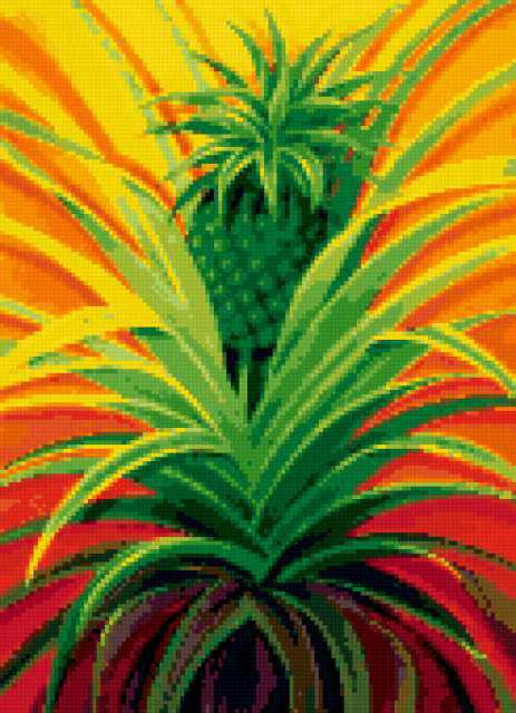 Ориентировочно так, схема вышивки «Ананас», созданная автором poltanya, будет выглядеть при отшиве на канве. Размер данной вышивки равен 123x170 крестов, при этом используется 38 цветов. Ключевые слова, по которым можно найти эту схему: фрукты, ананас, украшения для кухни, ананасы, урожай, панно, картина, плоды, живопись, искусство. Также, вы можете взглянуть на оригинальную картинку, соответствующую данной схеме вышивки.