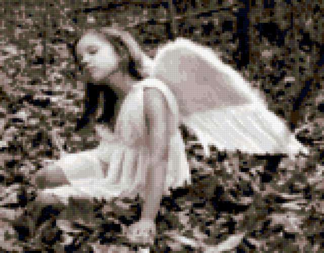 Ориентировочно так, схема вышивки «Ангел», созданная автором lovelife, будет выглядеть при отшиве на канве. Размер данной вышивки равен 156x122 крестов, при этом используется 18 цветов. Ключевые слова, по которым можно найти эту схему: жизнь, дети, ангелы. Также, вы можете взглянуть на оригинальную картинку, соответствующую данной схеме вышивки.