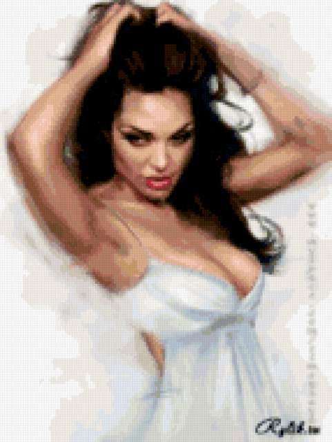 Ориентировочно так, схема вышивки «Анджелина Джоли», созданная автором anor, будет выглядеть при отшиве на канве. Размер данной вышивки равен 143x190 крестов, при этом используется 63 цветов. Ключевые слова, по которым можно найти эту схему: анджелина джоли, картина, девушка, знаменитости. Также, вы можете взглянуть на оригинальную картинку, соответствующую данной схеме вышивки.