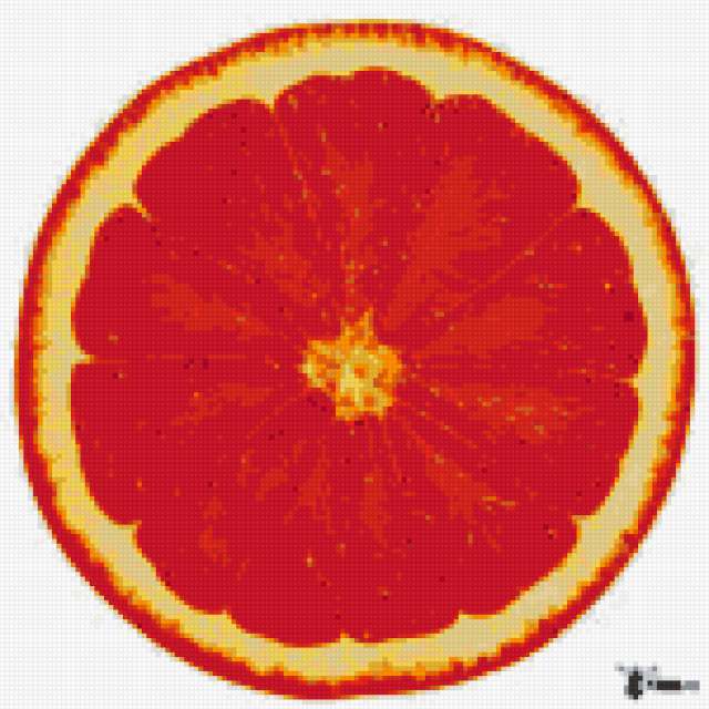 Ориентировочно так, схема вышивки «Апельсинчик», созданная автором irina89, будет выглядеть при отшиве на канве. Размер данной вышивки равен 150x150 крестов, при этом используется 23 цветов. Ключевые слова, по которым можно найти эту схему: апельсин, фрукт. Также, вы можете взглянуть на оригинальную картинку, соответствующую данной схеме вышивки.