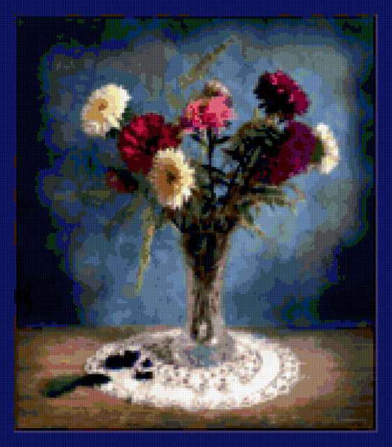 Ориентировочно так, схема вышивки «Астры», созданная автором Nataly_L, будет выглядеть при отшиве на канве. Размер данной вышивки равен 167x190 крестов, при этом используется 74 цветов. Ключевые слова, по которым можно найти эту схему: астры, цветы, букет. Также, вы можете взглянуть на оригинальную картинку, соответствующую данной схеме вышивки.