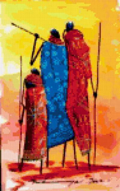 Ориентировочно так, схема вышивки «Африка», созданная автором mgalimosca, будет выглядеть при отшиве на канве. Размер данной вышивки равен 94x150 крестов, при этом используется 65 цветов. Ключевые слова, по которым можно найти эту схему: африка. Также, вы можете взглянуть на оригинальную картинку, соответствующую данной схеме вышивки.