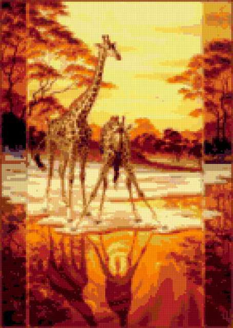 Ориентировочно так, схема вышивки «Африка», созданная автором Minin, будет выглядеть при отшиве на канве. Размер данной вышивки равен 135x190 крестов, при этом используется 33 цветов. Ключевые слова, по которым можно найти эту схему: живопись, искусство, картина, животные, жираф, африка, природа. Также, вы можете взглянуть на оригинальную картинку, соответствующую данной схеме вышивки.