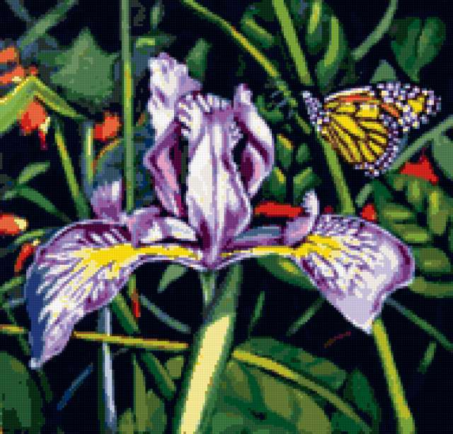 Ориентировочно так, схема вышивки «Бабочка и ирис», созданная автором poltanya, будет выглядеть при отшиве на канве. Размер данной вышивки равен 190x182 крестов, при этом используется 43 цветов. Ключевые слова, по которым можно найти эту схему: ирис, ирисы, цветы, весенние цветы, цветочки, бабочка, бабочки, цветы и бабочки, панно, природа, флора. Также, вы можете взглянуть на оригинальную картинку, соответствующую данной схеме вышивки.