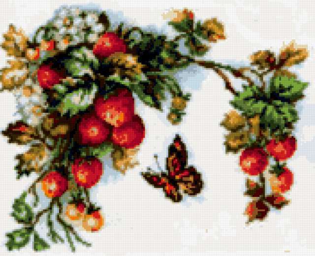 Ориентировочно так, схема вышивки «Бабочка и клубника», созданная автором poltanya, будет выглядеть при отшиве на канве. Размер данной вышивки равен 176x143 крестов, при этом используется 43 цветов. Ключевые слова, по которым можно найти эту схему: ягоды, ягодки, клубника, бабочка, цветы и бабочки, земляника, цветы, природа. Также, вы можете взглянуть на оригинальную картинку, соответствующую данной схеме вышивки.