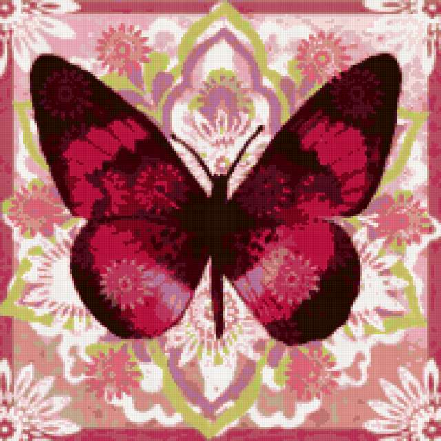 Ориентировочно так, схема вышивки «Бабочка», созданная автором Eddy, будет выглядеть при отшиве на канве. Размер данной вышивки равен 190x190 крестов, при этом используется 25 цветов. Ключевые слова, по которым можно найти эту схему: подушка, картина, бабочка, узор. Также, вы можете взглянуть на оригинальную картинку, соответствующую данной схеме вышивки.