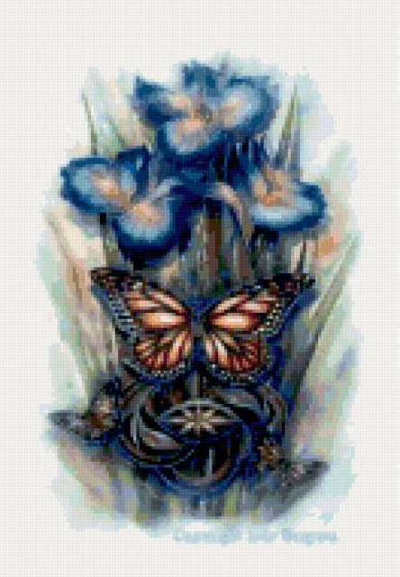 Ориентировочно так, схема вышивки «Бабочки в цветах», созданная автором -tatka-, будет выглядеть при отшиве на канве. Размер данной вышивки равен 132x190 крестов, при этом используется 77 цветов. Ключевые слова, по которым можно найти эту схему: цветы, бабочки. Также, вы можете взглянуть на оригинальную картинку, соответствующую данной схеме вышивки.