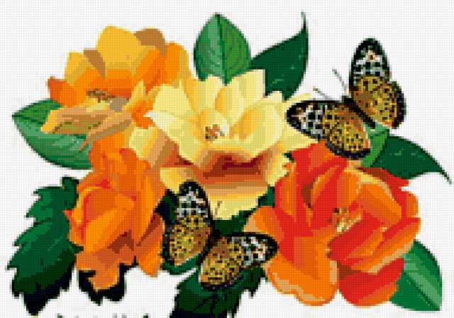 Ориентировочно так, схема вышивки «Бабочки на цветах», созданная автором kracota, будет выглядеть при отшиве на канве. Размер данной вышивки равен 190x133 крестов, при этом используется 52 цветов. Ключевые слова, по которым можно найти эту схему: цветы, бабочка. Также, вы можете взглянуть на оригинальную картинку, соответствующую данной схеме вышивки.