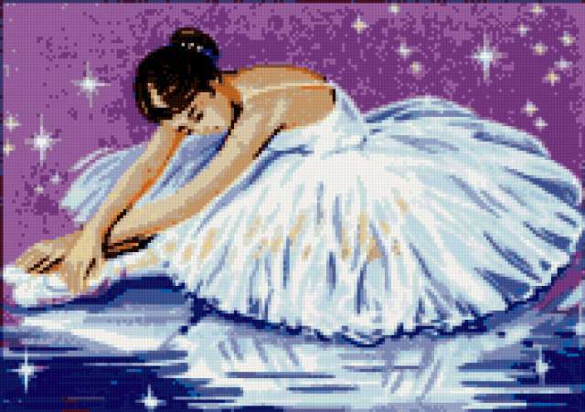 Ориентировочно так, схема вышивки «Балерина», созданная автором VA903M, будет выглядеть при отшиве на канве. Размер данной вышивки равен 190x134 крестов, при этом используется 33 цветов. Ключевые слова, по которым можно найти эту схему: балет, звёзды, девушка, балерина. Также, вы можете взглянуть на оригинальную картинку, соответствующую данной схеме вышивки.