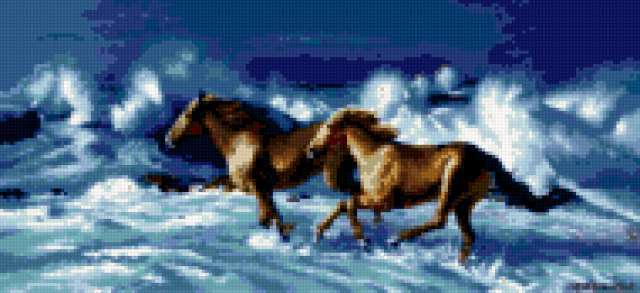 Ориентировочно так, схема вышивки «Бегущие по волнам», созданная автором -tatka-, будет выглядеть при отшиве на канве. Размер данной вышивки равен 190x87 крестов, при этом используется 53 цветов. Ключевые слова, по которым можно найти эту схему: животные, лошадь, конь. Также, вы можете взглянуть на оригинальную картинку, соответствующую данной схеме вышивки.