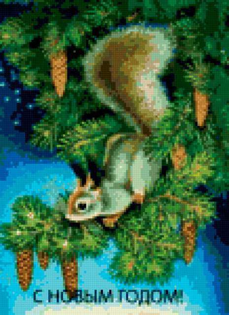 Ориентировочно так, схема вышивки «Белочка», созданная автором masyaska23, будет выглядеть при отшиве на канве. Размер данной вышивки равен 109x150 крестов, при этом используется 60 цветов. Ключевые слова, по которым можно найти эту схему: новый год. Также, вы можете взглянуть на оригинальную картинку, соответствующую данной схеме вышивки.