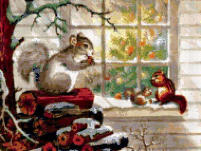 Ориентировочно так, схема вышивки «Белочки», созданная автором nizova, будет выглядеть при отшиве на канве. Размер данной вышивки равен 190x143 крестов, при этом используется 46 цветов. Ключевые слова, по которым можно найти эту схему: новый год. Также, вы можете взглянуть на оригинальную картинку, соответствующую данной схеме вышивки.