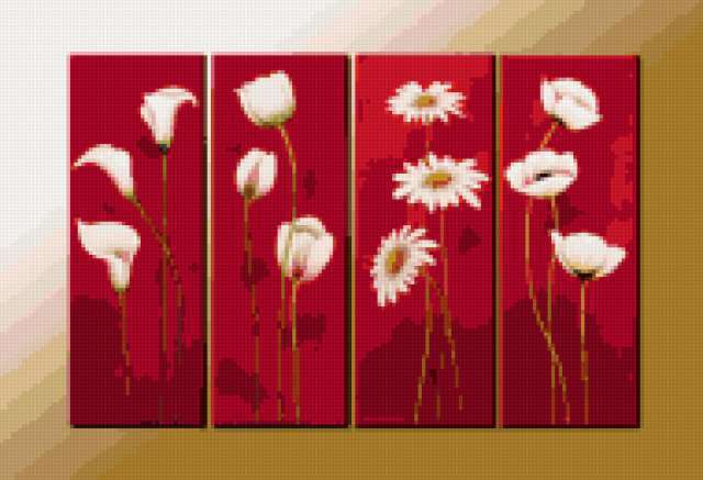 Ориентировочно так, схема вышивки «Белые на красном», созданная автором VA903M, будет выглядеть при отшиве на канве. Размер данной вышивки равен 190x130 крестов, при этом используется 45 цветов. Ключевые слова, по которым можно найти эту схему: цветы, тюльпаны, ромашки, калы. Также, вы можете взглянуть на оригинальную картинку, соответствующую данной схеме вышивки.