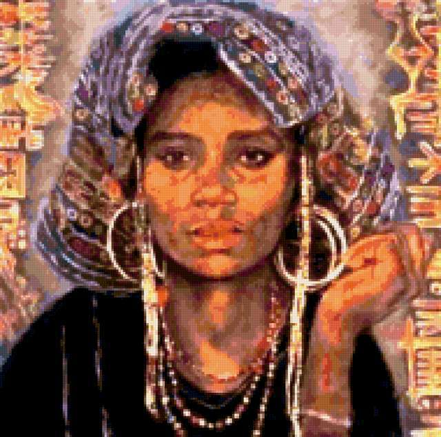 Ориентировочно так, схема вышивки «Берберка», созданная автором karitsa, будет выглядеть при отшиве на канве. Размер данной вышивки равен 190x188 крестов, при этом используется 78 цветов. Ключевые слова, по которым можно найти эту схему: восток, девушка, картина, разное. Также, вы можете взглянуть на оригинальную картинку, соответствующую данной схеме вышивки.