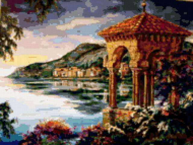 Ориентировочно так, схема вышивки «Беседка на морском берегу», созданная автором rybka6, будет выглядеть при отшиве на канве. Размер данной вышивки равен 190x143 крестов, при этом используется 63 цветов. Ключевые слова, по которым можно найти эту схему: пейзаж, архитектура, беседка, берег, море, горы, цветы, отражение, лето, картина, живопись, искусство. Также, вы можете взглянуть на оригинальную картинку, соответствующую данной схеме вышивки.