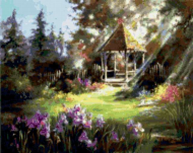 Ориентировочно так, схема вышивки «Беседка», созданная автором Elena_, будет выглядеть при отшиве на канве. Размер данной вышивки равен 190x151 крестов, при этом используется 77 цветов. Ключевые слова, по которым можно найти эту схему: беседка, сад, цветы. Также, вы можете взглянуть на оригинальную картинку, соответствующую данной схеме вышивки.