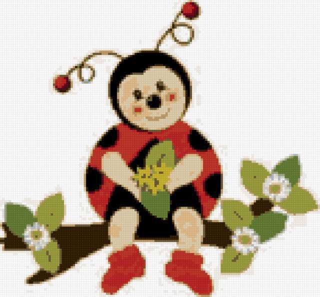 Ориентировочно так, схема вышивки «Божья коровка», созданная автором poltanya, будет выглядеть при отшиве на канве. Размер данной вышивки равен 145x135 крестов, при этом используется 19 цветов. Ключевые слова, по которым можно найти эту схему: божья коровка, жучки, детские сюжеты, детки, цветы, божьи коровки, kids, ladybug, bugs, lady-bugs. Также, вы можете взглянуть на оригинальную картинку, соответствующую данной схеме вышивки.