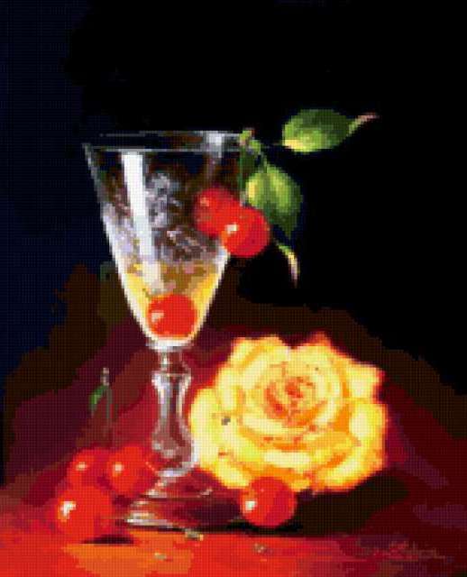 Ориентировочно так, схема вышивки «Бокал», созданная автором ponochka1386, будет выглядеть при отшиве на канве. Размер данной вышивки равен 154x190 крестов, при этом используется 66 цветов. К несчастью, автор не назначил для схемы ключевые слова. Также, вы можете взглянуть на оригинальную картинку, соответствующую данной схеме вышивки.