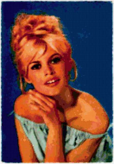 Ориентировочно так, схема вышивки «Брижит Бардо», созданная автором palena29, будет выглядеть при отшиве на канве. Размер данной вышивки равен 132x190 крестов, при этом используется 69 цветов. Ключевые слова, по которым можно найти эту схему: актриса. Также, вы можете взглянуть на оригинальную картинку, соответствующую данной схеме вышивки.