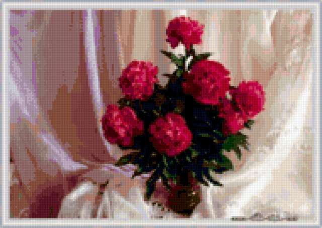 Ориентировочно так, схема вышивки «Букет пионов», созданная автором rusosh, будет выглядеть при отшиве на канве. Размер данной вышивки равен 190x135 крестов, при этом используется 68 цветов. Ключевые слова, по которым можно найти эту схему: натюрморт, цветы в вазе, букет, пионы. Также, вы можете взглянуть на оригинальную картинку, соответствующую данной схеме вышивки.
