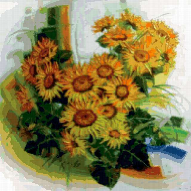 Ориентировочно так, схема вышивки «Букет подсолнухов», созданная автором Sineglazka, будет выглядеть при отшиве на канве. Размер данной вышивки равен 190x190 крестов, при этом используется 59 цветов. Ключевые слова, по которым можно найти эту схему: цветы, букет, подсолнухи. Также, вы можете взглянуть на оригинальную картинку, соответствующую данной схеме вышивки.