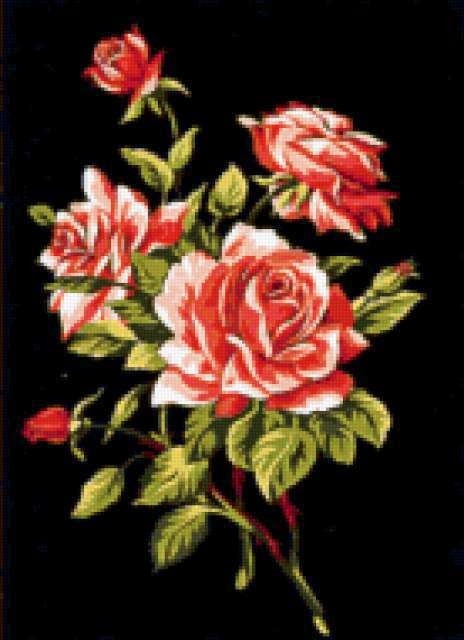 Ориентировочно так, схема вышивки «Букет роз на черном», созданная автором angelka73, будет выглядеть при отшиве на канве. Размер данной вышивки равен 138x190 крестов, при этом используется 69 цветов. Ключевые слова, по которым можно найти эту схему: Цветы. Также, вы можете взглянуть на оригинальную картинку, соответствующую данной схеме вышивки.