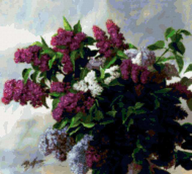 Ориентировочно так, схема вышивки «Букет сирени», созданная автором ibyibkkf, будет выглядеть при отшиве на канве. Размер данной вышивки равен 190x172 крестов, при этом используется 74 цветов. Ключевые слова, по которым можно найти эту схему: цветы в вазе. Также, вы можете взглянуть на оригинальную картинку, соответствующую данной схеме вышивки.