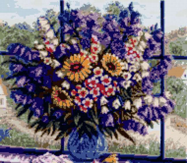 Ориентировочно так, схема вышивки «Букет у окна», созданная автором poltanya, будет выглядеть при отшиве на канве. Размер данной вышивки равен 190x166 крестов, при этом используется 26 цветов. Ключевые слова, по которым можно найти эту схему: букет, цветы, яркие букеты, колокольчики, подсолнухи, флора, окно, нежные лепестки, колокольчик, красота. Также, вы можете взглянуть на оригинальную картинку, соответствующую данной схеме вышивки.