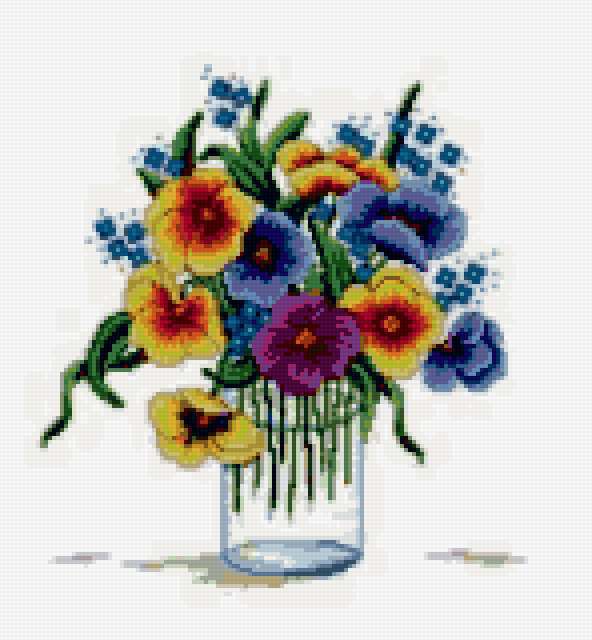Ориентировочно так, схема вышивки «Букет фиалок», созданная автором alenka, будет выглядеть при отшиве на канве. Размер данной вышивки равен 148x160 крестов, при этом используется 55 цветов. Ключевые слова, по которым можно найти эту схему: цветы, растения, анютины глазки, фиалка, флора, цветок. Также, вы можете взглянуть на оригинальную картинку, соответствующую данной схеме вышивки.