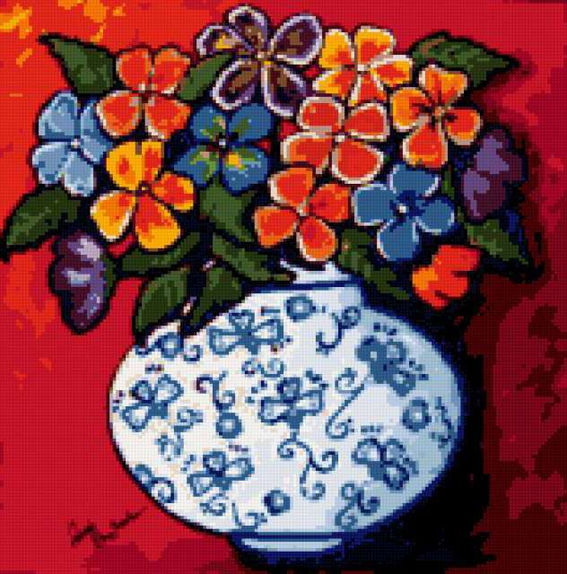 Ориентировочно так, схема вышивки «Букет цветов», созданная автором poltanya, будет выглядеть при отшиве на канве. Размер данной вышивки равен 176x178 крестов, при этом используется 31 цветов. Ключевые слова, по которым можно найти эту схему: яркие букеты, мир красок, цветы, флора, фиалки, ваза, красота, цветочки, букет, букеты. Также, вы можете взглянуть на оригинальную картинку, соответствующую данной схеме вышивки.